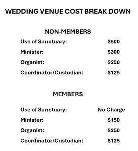 The use of our sanctuary and pastoral services are available at a reduced price to members because of their generosity and stewardship over time. Thus, member rates are available to couples who have been active participants in the life of the church for more than one year. The sanctuary use fee, made to Immanuel UCC is due at time of contract, and is non-refundable. All other payments are made to the individual staff member, and are due at the time of rehearsal.